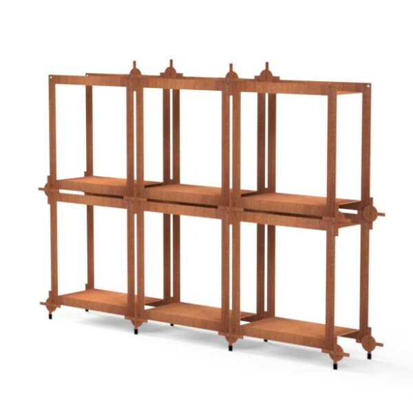 De opslag boxen zijn uitgevoerd in 4mm Cortenstaal en de koppelstukken in 6mm Cortenstaal.